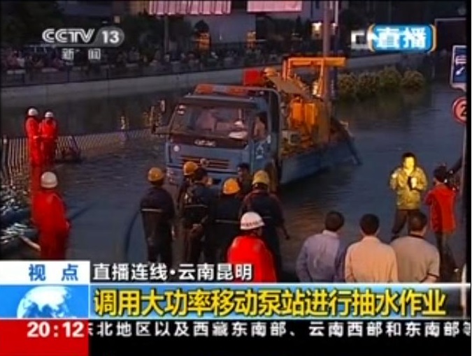 據(jù)央視7月19日“東方時空”新聞報道,從2013年7月18日早7點開始,云南昆明市降下了近4年以來最大的暴雨,12小時降雨量達190毫米,城區(qū)多處積水,交通受到嚴重影響。流經(jīng)城區(qū)的盤龍江流量是正常時期10倍左右,水位大幅上漲,導致江水倒灌。緊靠盤龍江的火車北站隧道是市區(qū)最大的淹水點,這條長300多米的汽車和行人通道積水20000立方米左右,最深處達5米。昆明市排水公司調(diào)來了全市唯一一臺大功率移動排水泵站投入搶險,經(jīng)過一夜的連續(xù)工作,在早高峰前排清了積水,恢復了該城市主干道交通。