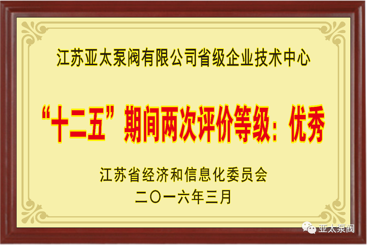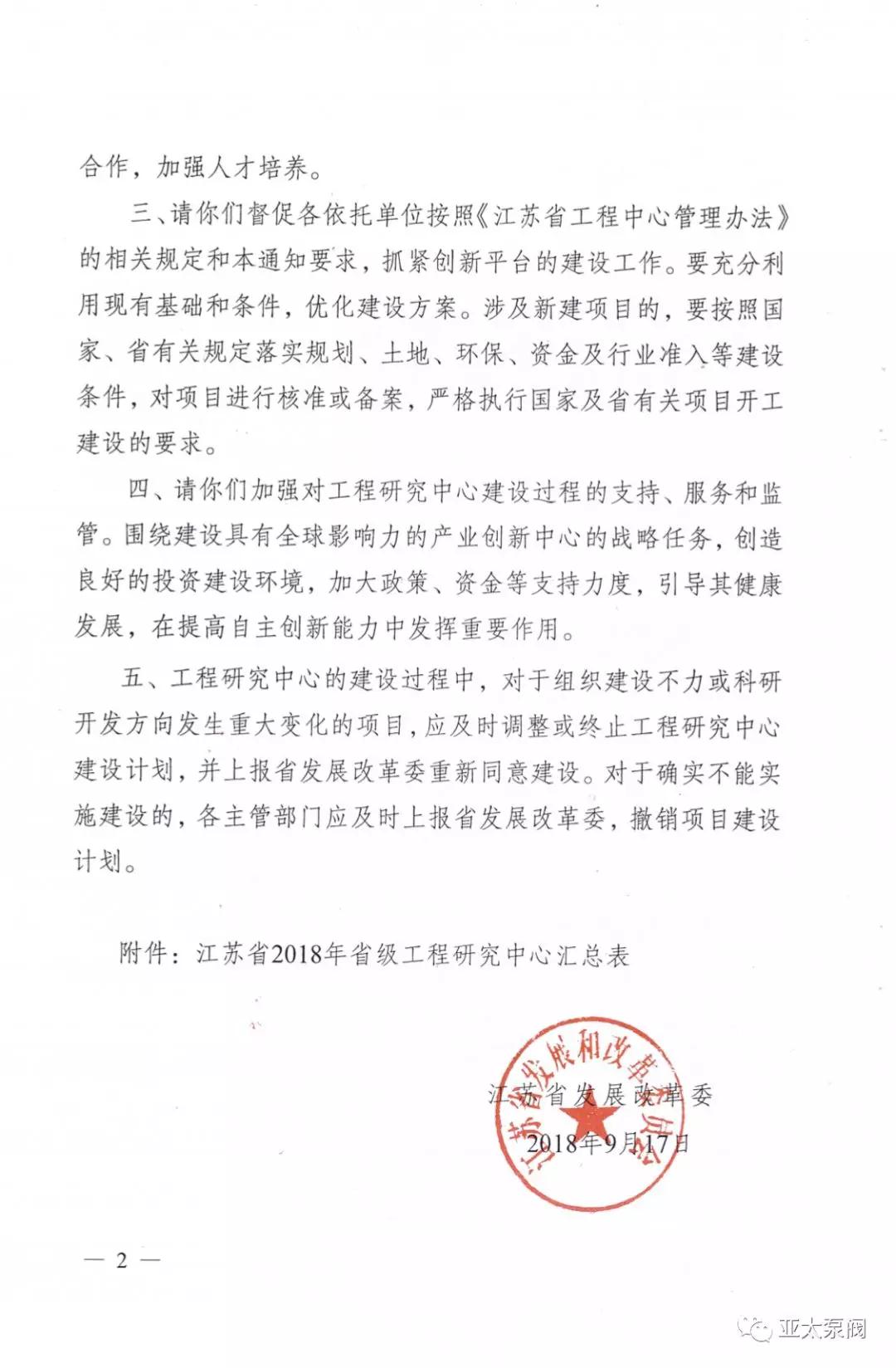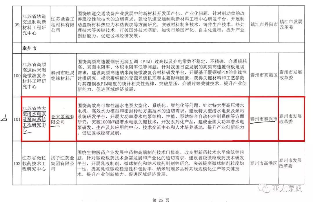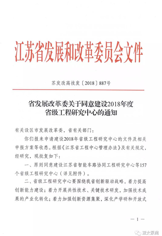 近日,省發改委正式發文,同意建設2018年度省級工程研究中心,亞太泵閥有限公司申報的省級創新平臺江蘇省特大型潛水電泵及泵站系統工程研究中心成功獲批,成為我省水泵行業唯 一入選企業。