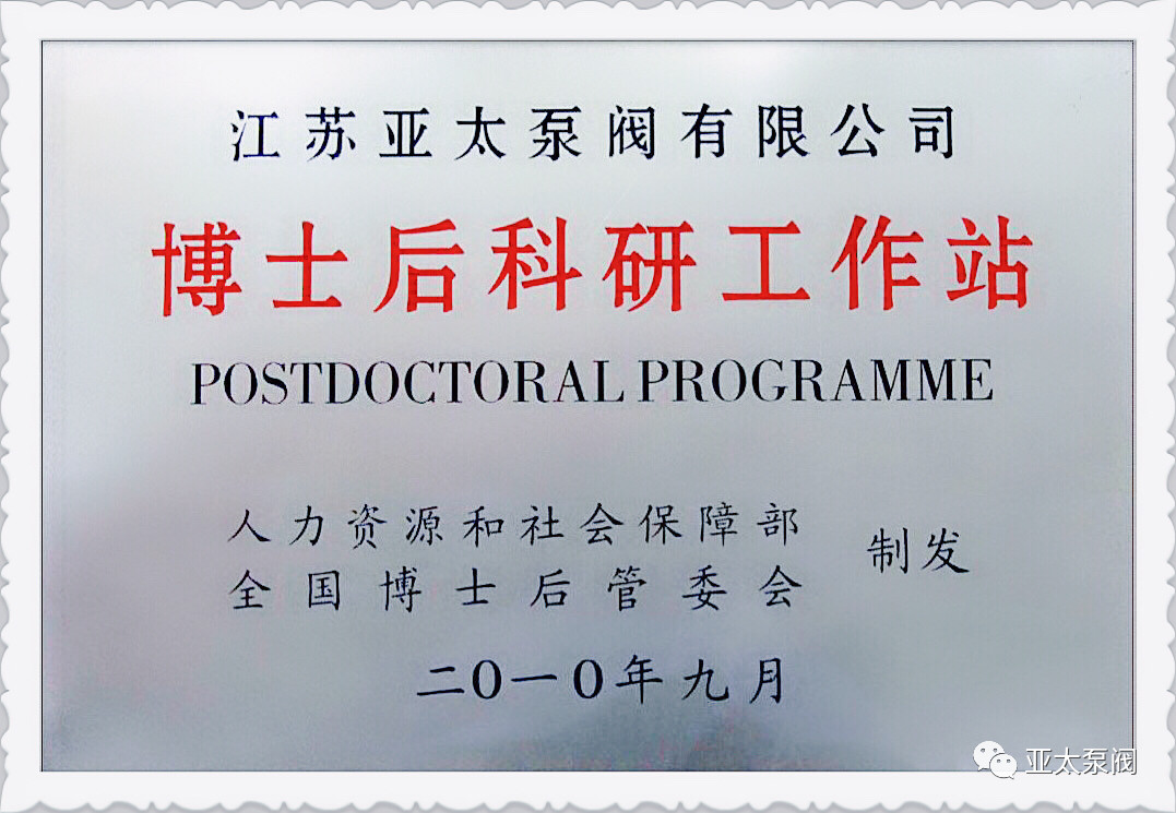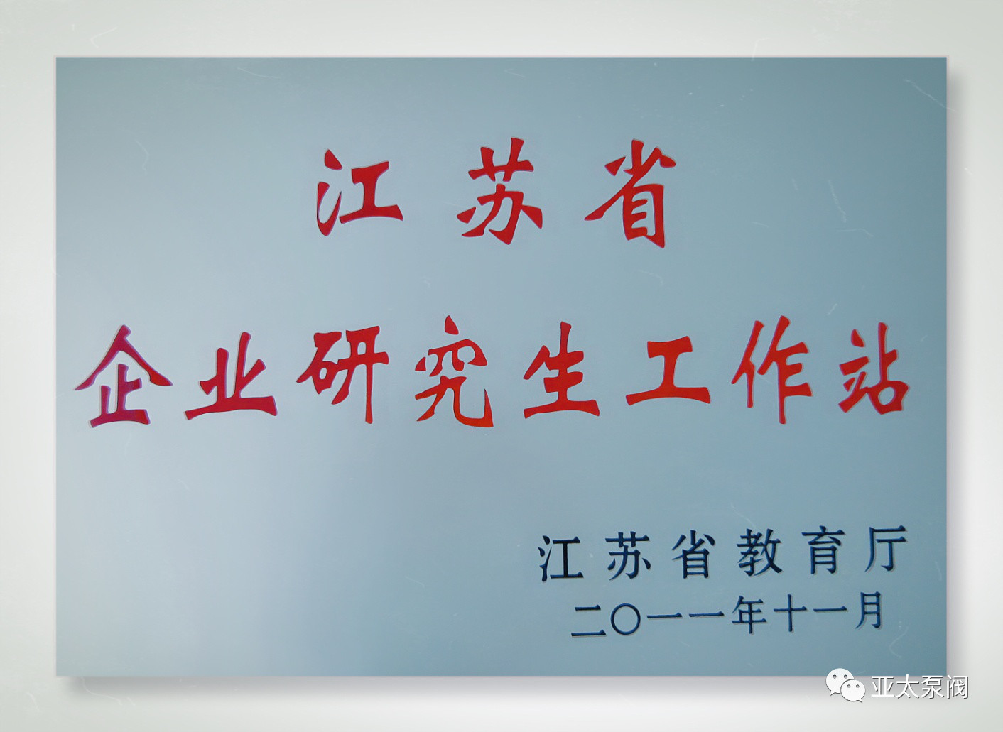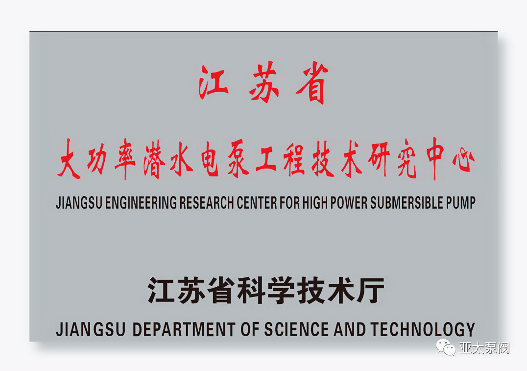 亞太泵閥有限公司是專業從事大功率潛水電泵及泵站系統研究的國家高新技術企業,企業先后獲批國家博士后科研工作站、江蘇省企業技術中 心、江蘇省大功率潛水電泵工程技術研究中心、江蘇省研究生工作站等省級平臺,技術創新能力顯著增強,先后獲得國家科技二等獎1項、省部級科技進步獎12項、承擔國家和省級研發項目11項、主持和參與制訂國家和行業標準8項。此次成功獲批省特大型潛水電泵及泵站系統工程研究中心,成為亞太泵閥第5個省級以上研發平臺。